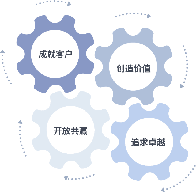 成就客户是一切决策的出发点,,创造价值是衡量所有工作的标准,,,追求卓越是我们做事做人的态度,,,,开放共赢是我们的格局也是最终的结果。。。。价值观的齿轮环环相扣,,推动着组织里的每个人不断向前。。。